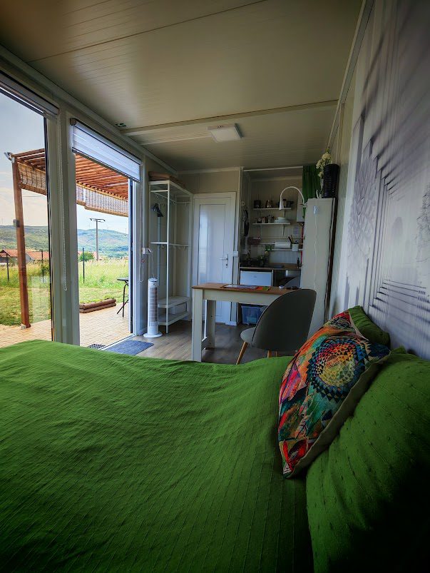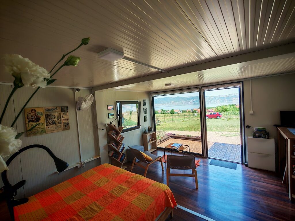 Studio (15m2) sa terasom (14m2) sa drvenim podom i pergolom opremljen u minimalističkom, skandinavskom stilu, sa kupatilom i čajnom kuhinjom. Poseduje 1 francuski ležaj za 2 osobe. Stakleni zid (3x2m) omogućava uživanje u prelepom pogledu na Dunav iz kreveta. Svaki delić prostora je veoma pažljivo iskorišćen da pruža komfor i povezanost sa prirodnim okruženjem.